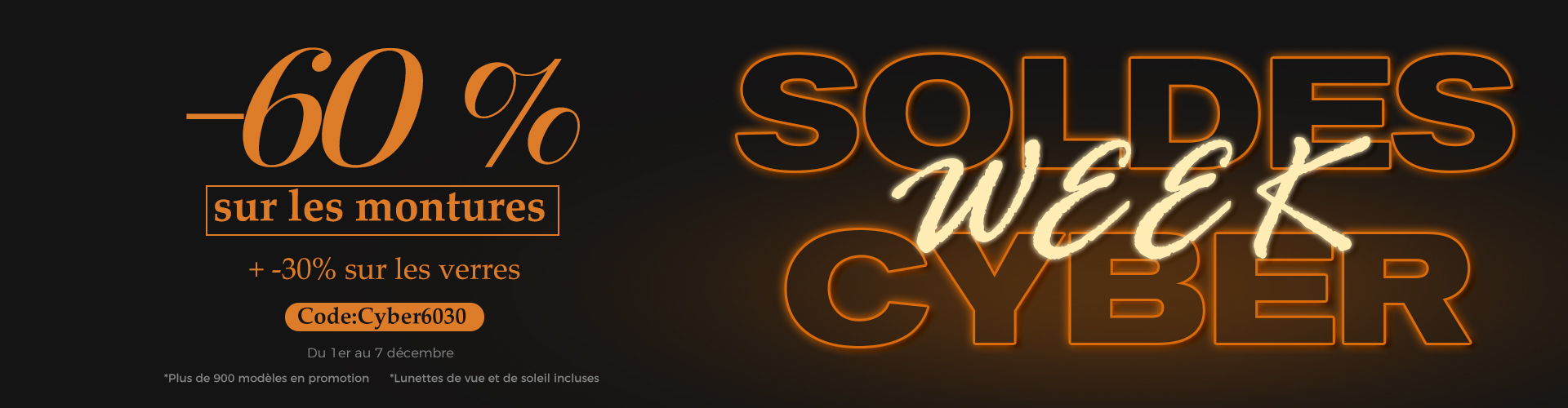 Cyber Week|-60 % sur les montures + -30 % sur les verres|Code: Cyber6030